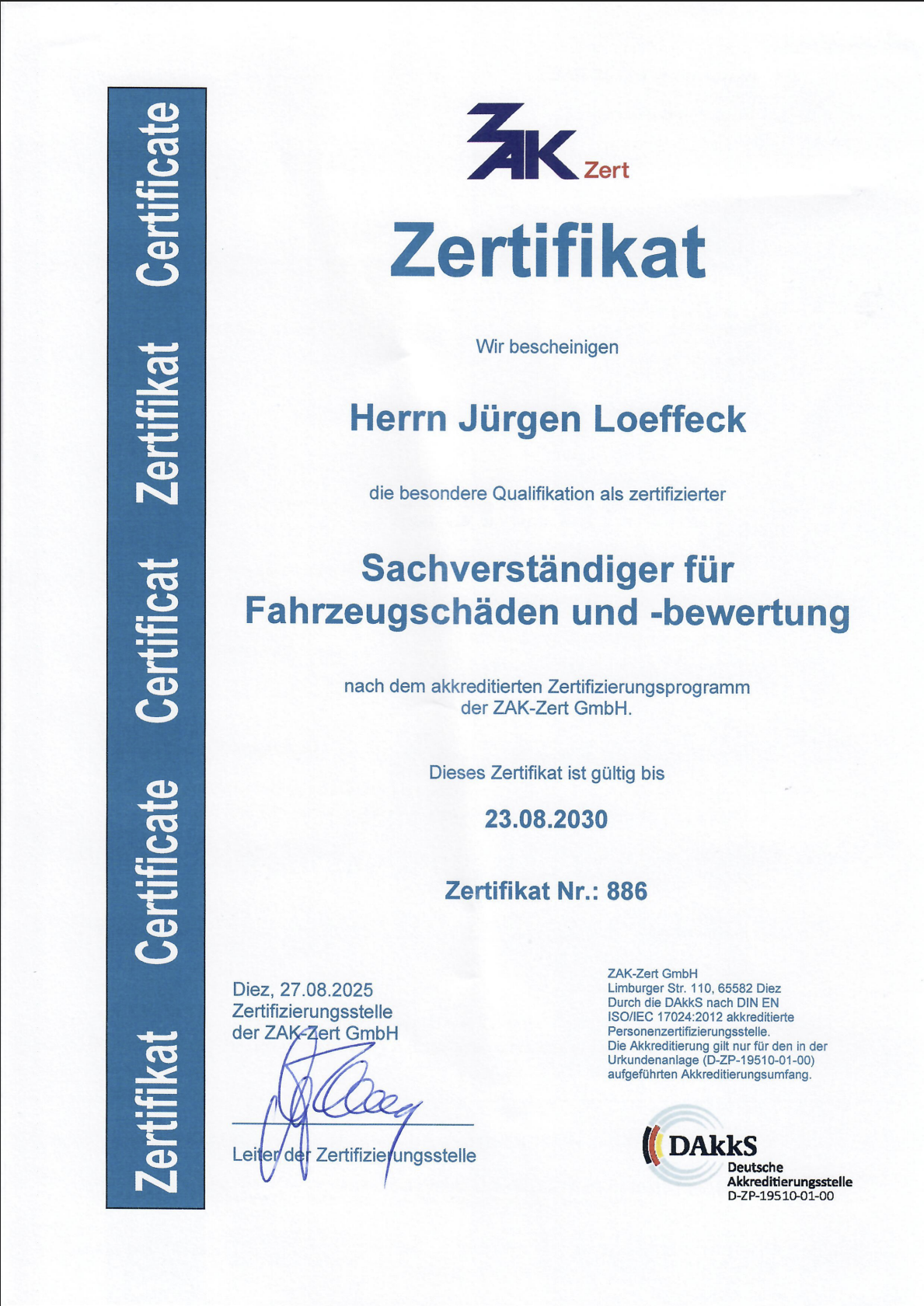 zertifizierter Sachverständiger nach dem akkreditierten Zertifizierungsprogramm der ZAK-Zert GmbH